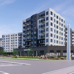 In development: 8-story, 300-apartment complex with 480 parking spaces.